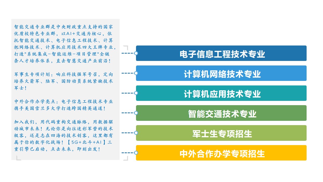 智能交通专业群是中央财政支持的、国家优质校特色专业群,是服务智慧交通产业的项目应用,针对交通系统集成、交通系统运维、交通项目管理等岗位(群)所需的人才培养新需求,并基于智能交通应用的主流技术网络架构,选择智能交通技术、电子信息工程技术、计算机网络技术、计算机应用技术等4个专业组建了该专业群。系部近三年间完成省、厅级科研项目10余项,省级以上精品在线开放课程3门、省级一流核心课程2门。