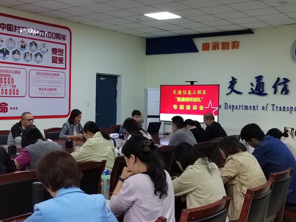 为加强作风建设,增强底线思维,发挥榜样作用,积极弘扬遵规守纪光荣传统和优良作风,10月18日下午,交通信息工程系党总支在党员之家组织开展“勤廉榜样巡礼”专题座谈会。本次会议由组织员闫巧云主持,班子成员及全体教工党员参会。