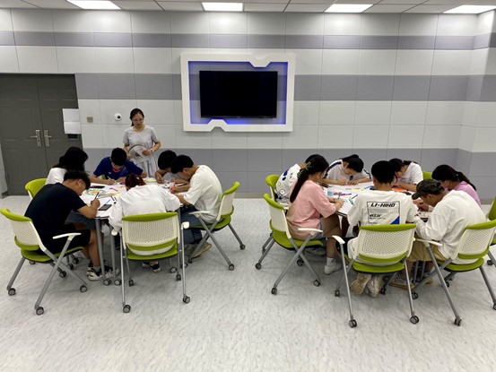 接着,同学们拿起纸和笔,开始创作。曹珍萍提示大家,颜色、色块的大小、数量,没有对错之分,都随自己的心意去尽情表达。随着绘画的深入,脑海中可能会不断的涌现某些记忆的片段或产生某种情绪,只需要关注或记下就好,带着这种状态完成所绘的曼陀罗。