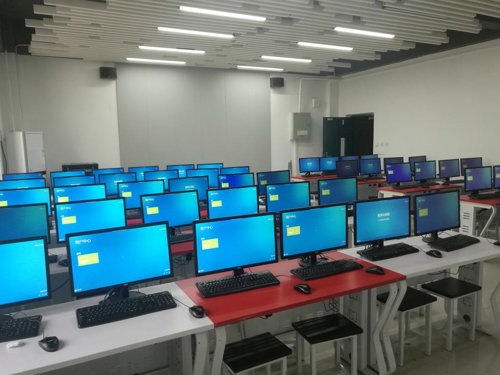 云桌面基础实训室有8个,工位数410多个,总占地面积约600平方。每个实训室均标配有电脑(瘦客户端)、讲台、投影、音响设备、空调、智能化人脸门禁系统和云桌面智能管理系统等。云桌面基础实训室集实践教学、教师科研、师生技能大赛、认证考试、社会服务等多功能为一体。